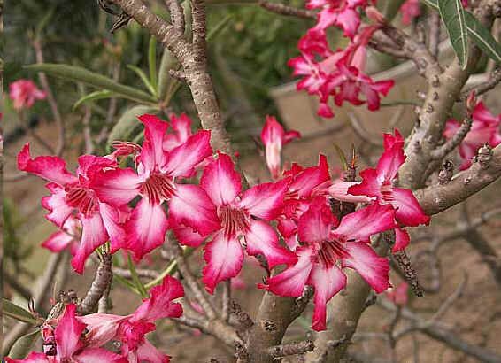 Adenium somalense, la Rose du Désert, est originaire d’Arabie. Il peut être cultivé tel un bonsaï ou un arbuste. En nature il peut atteindre 5 à 8 pieds. La forme du tronc, le feuillage et les fleurs sont tous très attrayants. L'arbre possède de magnifiques longues feuilles vertes et lustrées. Elles tomberont toutes en hiver. Les fleurs d'un rose foncé et de 5 cm de diamètre sont en forme de trompette et poussent à l'année en plein soleil. La Rose du Désert développe un tronc massif avec l'âge, mais fleurira très tôt, habituellement lorsqu'il aura atteint 6" de haut. Taillez seulement après l'hiver. Évitez les tailles sévères. Les nouvelles pousses peuvent être taillées régulièrement. Lavez-vous les mains après la taille, le latex de son bois exposé est poison. Zones de rusticité 9 -11, (4°C/+40°F,-5°C/25°F) en hiver. De longues périodes sous 40°F (4°C) pourraient tuer le bout de certaines branches. En été, si possible, placer l'arbre en plein soleil ou à un endroit partiellement ensoleillé. Il a besoin de beaucoup de lumière et d'air frais. Placez au soleil en hiver. Idéalement, la température ne devrait jamais descendre sous 54°F. Toutefois, en hiver, il est préférable de conserver l'arbre entre 54-61°F, donnez à l'arbre la période de repos dont il a besoin. Utilisez un mélange constitué de 2 parties de mousse de sphaigne pour une partie de sable. Il aime un sol légèrement alcalin. Fertilisez au mois, au Printemps et en Été. Arrosez régulièrement lors de la croissance, conservez plutôt sec en Hiver. L'arbre a besoin d'un excellent drainage. Il perdra des feuilles prématurément s'il est trop arrosé.