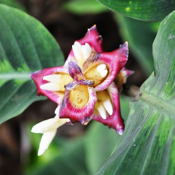 Plante tropicale avec des tiges en spirale et des fleurs rouges éclatantes, idéale pour les jardins humides ou les grands espaces.