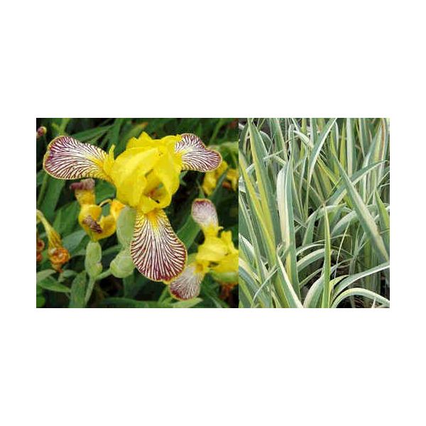 Les Iris variegata hybrides sont natifs du Centre de l'Europe, du Nord des Balkans et du Sud de la Russie. Ce sont des vivaces atteignant 18-24 pouces de haut. La variété Variegata réfère aux 2 couleurs de la fleur plutôt qu'au feuillage. Ceci est un mélange de plusieurs variétés et couleurs de l'espèce. Les fleurs sont constituées de 3 sépales et 3 pétales. Les fleurs sont jaune pâle et rayées de marques foncées. La floraison se produit tard au Printemps jusqu'à tôt en Été. Les feuilles sont vert foncé et sont définies par une large bordure blanche. Ce feuillage vert rayé de blanc et persistant, est très attrayant. La plante se propage au moyen de ses rhizomes, situés sous la surface du sol. Zones de rusticité 3-9, (-37°C/-35°F, -5°C/25°F) en Hiver. Cette plante tolère une variété de sols, mais préfère un sol riche. Une fois établit, cet Iris résiste à la sécheresse, mais doit bien être arrosé lorsqu'il est encore jeune. Tout bon sol de jardinage peut convenir pour autant qu'il soit bien drainé. Cultivez en plein soleil, ou partiellement à l'ombre.