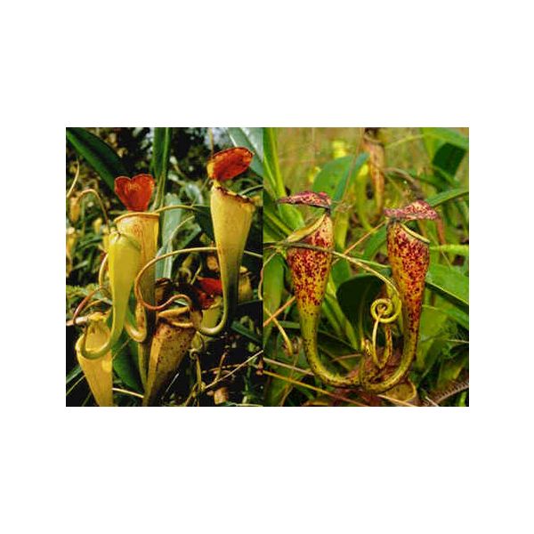 | Germination | Nepenthes seeds should be started on chopped live sphagnum moss in very damp but not wet conditions. It is best to spray the sown seeds with a fungicide. Cover the top of the pot with clear plastic so the humidity will remain high, place them in an area with real nice strong light and keep the temperature around 32øC/90øF. When you see some tiny plants starting to sprout, slowly open the top of the pot, a little each day, so that the new seedlings don't go into shock from the humidity being lowered too quickly. Germination usually occurs in a few months, but it can take longer, sometimes nothing can happen for a year, don't give up. Make sure that it gets good air circulation. |