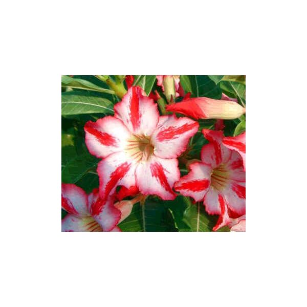 Adenium Harry Potter est cultivé à Taïwan. Harry Potter est l'Adenium le plus populaire à Taiwan. Il peut être cultivé tel un arbuste ou un petit arbre. En nature il peut atteindre 5 à 8 pieds et est deux fois moins large que haut. La forme du tronc, le feuillage et les fleurs sont tous très attrayants. La base est large (obesum) et de différentes formes. L'arbre possède de magnifique et longues feuilles vertes, lustrées. Elles tomberont toutes en Hiver. Les fleurs rayées de rouge au centre de chaque pétale, se développent à l'année si l'arbre est en plein soleil. La floraison est importante. Chaque fleur atteint de 5-7 cm de diamètre. La Rose du Désert développe un tronc massif avec l'âge, mais fleurira très tôt, habituellement lorsqu'il aura atteint 6" de haut. Taillez seulement après l'Hiver. Évitez les tailles sévères. Les nouvelles pousses peuvent être taillées régulièrement. Lavez-vous les mains après la taille, le latex de son bois exposé est poison. Zones de rusticité 9 -11, (4°C/40°F,-5°C/25°F) en Hivers. De longues périodes sous 40°F (4°C) pourraient tuer le bout de certaines branches. En Été, si possible, placer l'arbre en plein soleil ou à un endroit partiellement ensoleillé. Il a besoin de beaucoup de lumière et d'air frais. Placez au soleil en Hiver. Idéalement, la température ne devrait jamais descendre sous 54°F. Toutefois, en Hiver, il est préférable de conserver l'arbre entre 54-61°F, donnez à l'arbre la période de repos dont il a besoin. Utilisez un mélange constitué de 2 parties de mousse de sphaigne pour une partie de sable. Il aime un sol légèrement alcalin. Fertilisez au mois, au Printemps et en Été. Arrosez régulièrement lors de la croissance, conservez plutôt sec en Hiver. L'arbre a besoin d'un excellent drainage. Il perdra des feuilles prématurément s'il est trop arrosé.