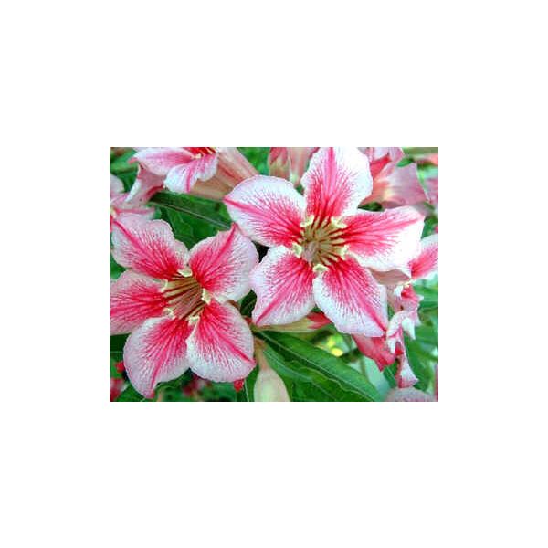 Adenium Histoire d'Amour d'Étoile est cultivé à Taïwan. C'est une Adenium de premier choix pour la pollinisation. Il peut être cultivé tel un arbuste ou un petit arbre. En nature il peut atteindre 5 à 8 pieds et est deux fois moins large que haut. La forme du tronc, le feuillage et les fleurs sont tous très attrayants. La base est large (obesum) et de différentes formes. L'arbre possède de magnifique et longues feuilles vertes, lustrées. Elles tomberont toutes en Hiver. Les fleurs blanches sont merveilleusement marquées de rose. Elle peuvent atteindre de 3-5 cm de diamètre. La Rose du Désert développe un tronc massif avec l'âge, mais fleurira très tôt, habituellement lorsqu'il aura atteint 6" de haut. Taillez seulement après l'Hiver. Évitez les tailles sévères. Les nouvelles pousses peuvent être taillées régulièrement. Lavez-vous les mains après la taille, le latex de son bois exposé est poison. Zones de rusticité 9 -11, (4°C/40°F,-5°C/25°F) en Hivers. De longues périodes sous 40°F (4°C) pourraient tuer le bout de certaines branches. En Été, si possible, placer l'arbre en plein soleil ou à un endroit partiellement ensoleillé. Il a besoin de beaucoup de lumière et d'air frais. Placez au soleil en Hiver. Idéalement, la température ne devrait jamais descendre sous 54°F. Toutefois, en Hiver, il est préférable de conserver l'arbre entre 54-61°F, donnez à l'arbre la période de repos dont il a besoin. Utilisez un mélange constitué de 2 parties de mousse de sphaigne pour une partie de sable. Il aime un sol légèrement alcalin. Fertilisez au mois, au Printemps et en Été. Arrosez régulièrement lors de la croissance, conservez plutôt sec en Hiver. L'arbre a besoin d'un excellent drainage. Il perdra des feuilles prématurément s'il est trop arrosé.