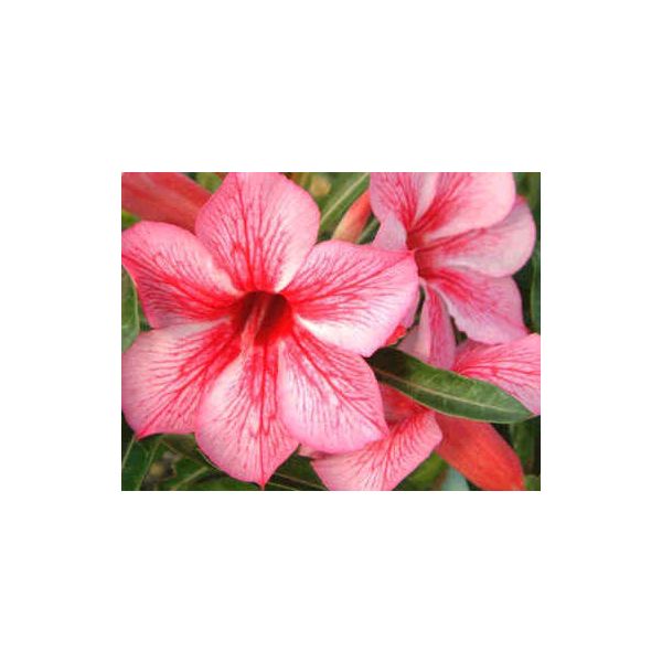 Adenium Étoile Scintillante Rouge est cultivé à Taïwan. Cette variété est un futur parent pour une fleur blanche aux rayures rouges. Il peut être cultivé comme un arbuste ou un petit arbre. En nature il peut atteindre 5 à 8 pieds et est deux fois moins large que haut. La forme du tronc, le feuillage et les fleurs sont tous très attrayants. La base est large (obesum) et de différentes formes. L'arbre possède de magnifique, longues feuilles vertes et lustrées. Elles tomberont toutes en Hiver. Les rayures rouges en font une fleur éclatante. La floraison est abondante et chaque fleur est large, 6-8 cm de diamètre. La Rose du Désert développe un tronc massif avec l'âge, mais fleurira très tôt, habituellement lorsqu'il aura atteint 6" de haut. Taillez seulement après l'hiver. Évitez les tailles sévères. Les nouvelles pousses peuvent être taillées régulièrement. Lavez-vous les mains après la taille, le latex de son bois exposé est poison. Zones de rusticité 9 -11, (4°C/+40°F,-5°C/25°F) en Hivers. De longues périodes sous 40°F (4°C) pourraient tuer le bout de certaines branches. En Été, si possible, placer l'arbre en plein soleil ou à un endroit partiellement ensoleillé. Il a besoin de beaucoup de lumière et d'air frais. Placez au soleil en Hiver. Idéalement, la température ne devrait jamais descendre sous 54°F. Toutefois, en Hiver, il est préférable de conserver l'arbre entre 54-61°F, donnez à l'arbre la période de repos dont il a besoin. Utilisez un mélange constitué de 2 parties de mousse de sphaigne pour une partie de sable. Il aime un sol légèrement alcalin. Fertilisez au mois, au Printemps et en Été. Arrosez régulièrement lors de la croissance, conservez plutôt sec en Hiver. L'arbre a besoin d'un excellent drainage. Il perdra des feuilles prématurément s'il est trop arrosé.