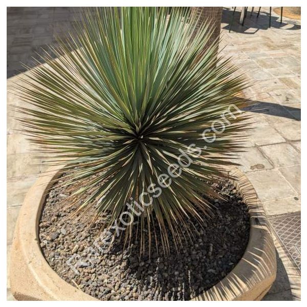 Yucca rostrata est le plus spectaculaire de tous les Yucca et le plus résistant au froid de tout ceux formant un tronc. Il est originaire du Texas et du Nouveau-Mexique et atteind 4-5 mètres de haut. En 5 ans, vous aurez un arbre de 8 pieds. Cet arbre est cultivé pour sont feuillage. C'est une plante magnifique avec sa couronne de longues feuilles étroites bleu-vert. Les feuilles émergent du centre de l'arbre. Elles font 25-60 cm de long par 1 à 1.5 cm de large. Le contour des feuilles est jaune et denté. En général, Yucca rostrata développe un seul tronc, mais quelques fois plusieurs couronnes de feuilles se développent. Les fleurs sont blanches et naissent sur une tige qui s'élève au dessus de la plante. La grappe fait environ 60 cm de long. Les fleurs individuelles sont en forme de clôches et font 3.8 cm de largeur et comportent 3 pétales et 3 sépales, apparaissant de Juin à Septembre. L'espèce rostrata réfère au fruit qui ressemblent véritablement à un bec d'oiseau. Le fruit peut être cuit et mangé après que les semences furent retirées. Les larges pétales sont utilisées pour les salades. Zones de rusticité 5-11, (-26°C/-15°F, 4°C/40°F) en Hiver. En Hiver, les plantes établies ont besoin d'eau une fois par mois, mais régulièrement en Été. L'arbre développera des branches avec l'âge, et plus rapidement dans un sol alcalin. Les Yuccas résistent bien à la sécheresse et performent bien en pot. Procurer un plein soleil, un bon drainage et un peu d'eau en Été.